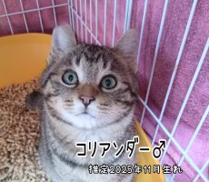 相談中コリアンダーくん 2026年1月保護。協力ボランティア様からの受け入れ。4兄妹のうちのひとりです。子猫らし...